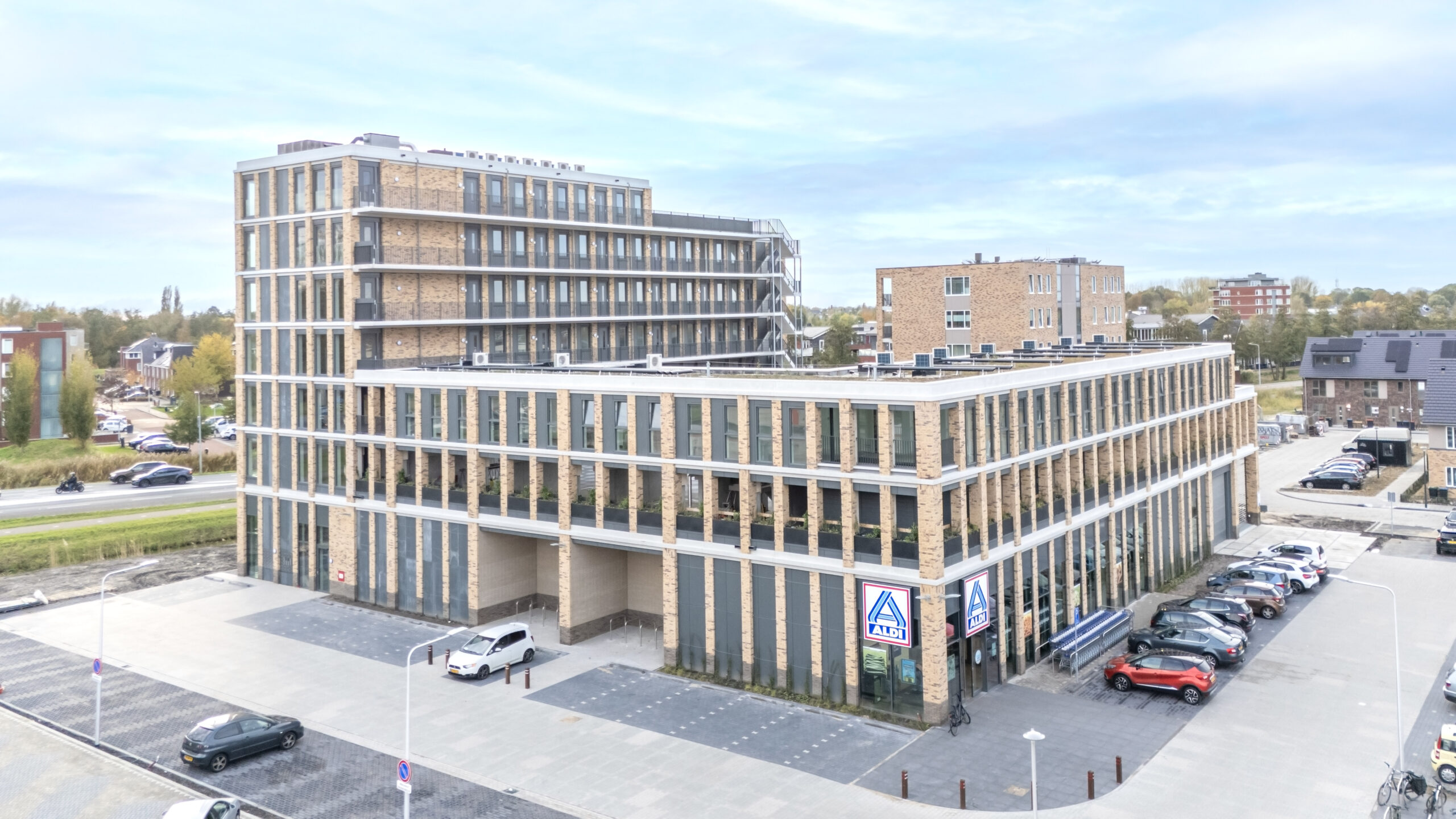 De gloednieuwe Aldi is weer op zijn vertrouwde plek terug en is qua winkeloppervlak ongeveer even groot als de ‘oude’ supermarkt met een oppervlakte van 1.600 m2. Naast een nieuwe Aldi realiseerden we 36 woningen voor verschillende doelgroepen. Bijzonder is de woongroep voor 9 zelfstandig wonende jongeren met autisme. Voor de woningen is er een parkeervoorziening van 44 parkeerplaatsen op het dak van de supermarkt en voor het winkelend publiek zijn er 74 parkeerplaatsen op het maaiveld.